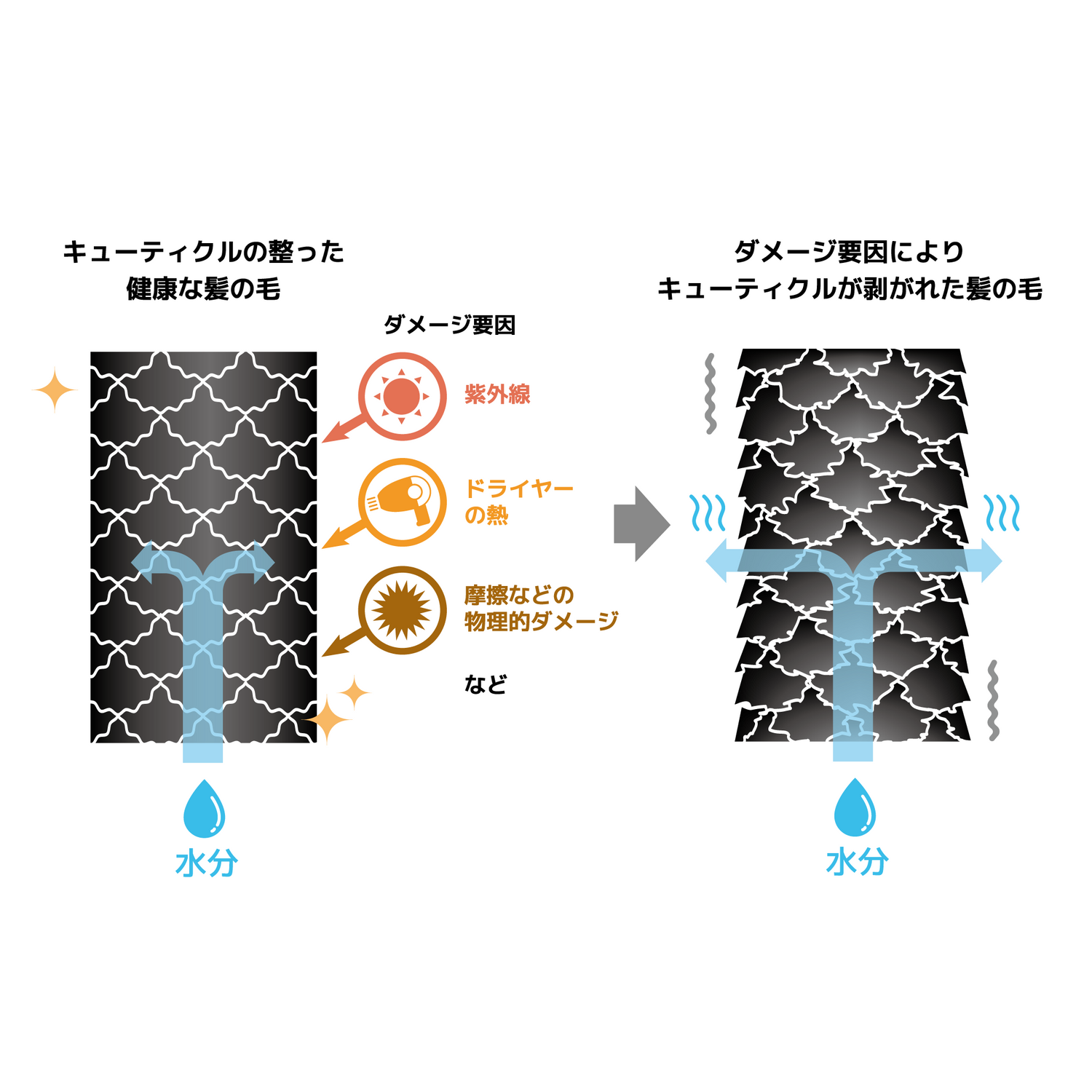 キューティクルが傷んで剥がれたり削れたりすると、なめらかさ・指通り・ツヤが損なわれるとともに、傷みが進みやすくなります。紫外線、汗や皮脂による汚れなどでダメージを受けた髪のキューティクルを集中的に補修し、若々しい印象の健やかな髪へ導きます。
