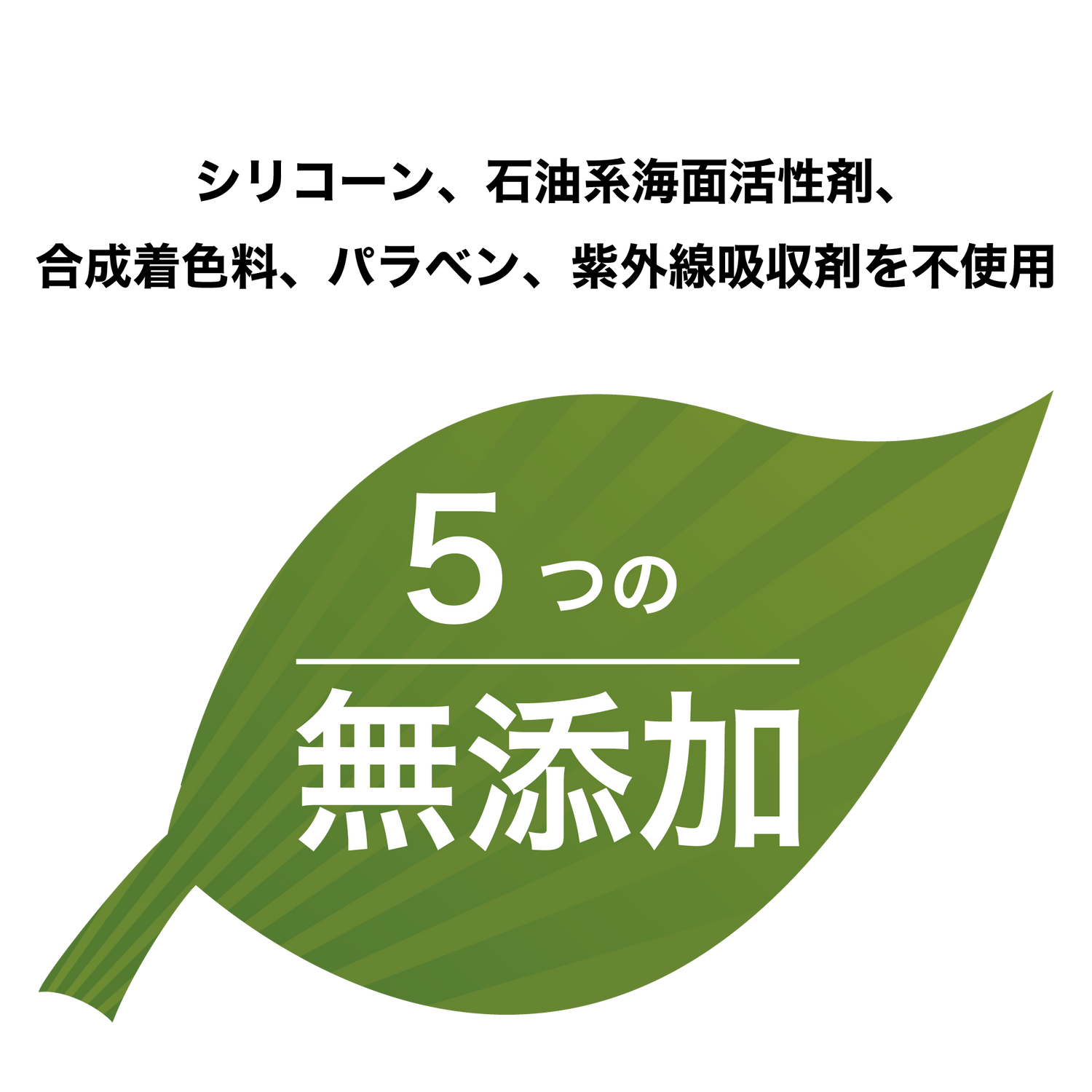シリコーン、石油系界面活性剤、合成着色料、パラベン、紫外線吸収剤等の髪や頭皮に負担をかけやすい添加物を不使用。髪や頭皮環境に優しい使用感で、敏感肌の人だけでなく、髪をキレイにしたい人におすすめです。