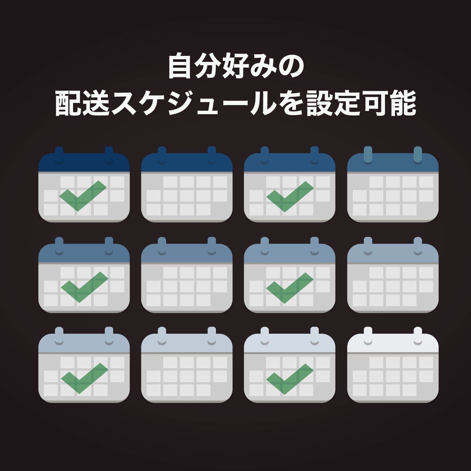 使用頻度に合わせて、お客様に商品をお届けします。初回注文時に配送頻度を自分好みに配送スケジュールをカスタムできるため、買う手間や買い忘れを防ぐことができます。配送頻度につきましては、途中で変更することができます。